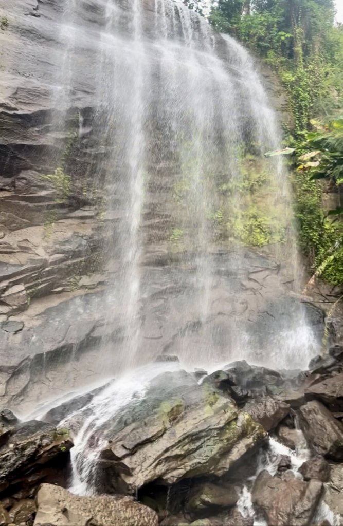 Walking along the steep corners of the trail can be exciting, especially when you see a natural rope swing where you can take a short rest and enjoy the view. As you get close to the end of the hike, the sound of rushing water gets louder, building excitement for what’s ahead.