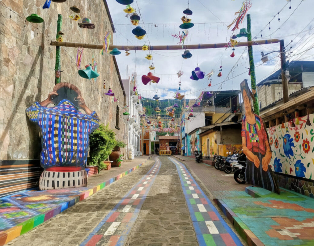 Standing on the Mirador in San Juan La Laguna, visitors enjoy not only the amazing views of Lake Atitlán but also the lively display of local art that shows the heart of Guatemalan culture. The wooden walkway, decorated with eye-catching murals and special sculptures, acts as both a path and a gallery, inviting travelers to see the bright work of the town’s skilled artists. Each colorful piece tells a story, mixing Mayan art traditions with modern methods, connecting the past with the present.